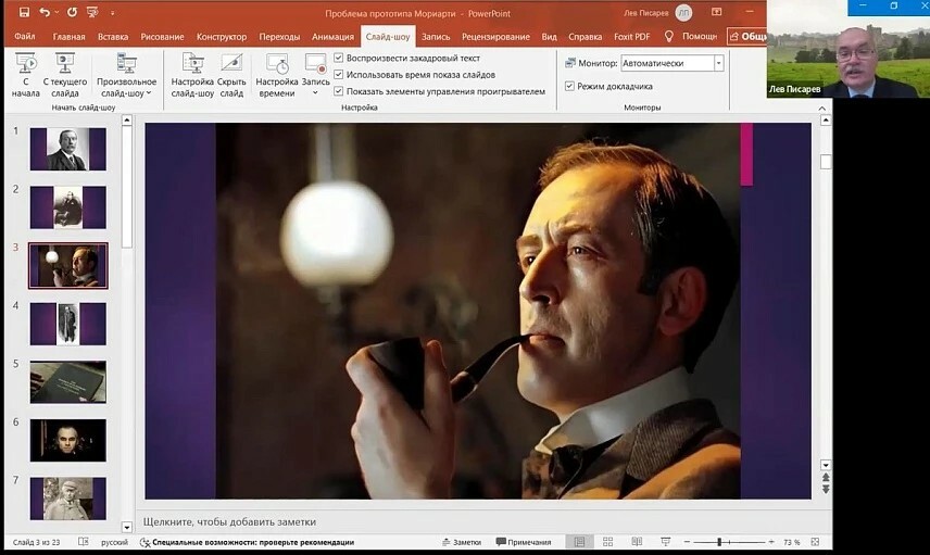 Следующим выступил заведующий кафедрой романо-германской филологии Лев Викторович Писарев с докладом на тему «Образ профессора Мориарти в произведениях А. Конан Дойля: проблема прототипа».В своем докладе Лев Викторович отметил, что в творчестве английского писателя Артура Конан Дойля значительное место занимают произведения о гениальном сыщике Шерлоке Холмсе. Образ Холмса стал визитной карточкой самого писателя и даже тяготил его, поэтому в 1893 году Артур Конан Дойль решил от него избавиться, введя в произведения главного антагониста Шерлока Холмса, злого гения – профессора Мориарти. Образ профессора Мориарти, «Наполеона преступного мира», поражает воображение читателей и зрителей не меньше, чем образ самого Холмса.Докладчик отметил, что как образ Шерлока Холмса, так и образы других героев произведений о нем могут во многом являться собирательными. Возможно, таким является и образ профессора Мориарти. Исследование прототипов профессора Мориарти представляется интересным и полезным для расширения смыслового поля произведения.Рассмотрев ряд прототипов профессора Мориарти, Л. В. Писарев отметил, что все предложенные исследователями прототипы могут лишь частично отражать характеристики персонажа, и предложил абсолютно новый и неожиданный прототип Мориарти, с которым А. Конан Дойль мог быть и даже должен был быть знаком – деятеля эпохи Возрождения в Англии XVI века Джона Ди.Свою неожиданную гипотезу Л. В. Писарев обосновал интересным сравнением: и Мориарти, и Джон Ди были математиками и астрономами, оба в двадцать с небольшим лет стали преподавателями университетов, в которых они получили кафедру математики, оба читали в этих университетах курс математики и были широко известны в научных кругах нестандартностью и абстрактностью мышления, а также высокими организаторскими способностями. Мориарти был гениальным организатором и идеологом преступного мира, а Джон Ди был одним из организаторов английской разведки, идеологом Британской империи, заложившим ее основы, вдохновителем создания Британского флота, человеком, талантливым во многих областях науки.Сопоставление этих двух образов расширяет понимание личности и роли главного героя произведений, Шерлока Холмса. Сколь полезной для Англии была деятельность ученого Джона Ди, столь же разрушительной и вредоносной была деятельность профессора Мориарти, при столь же могучем интеллектуальном потенциале. При допустимости такого сравнения личность Шерлока Холмса и величие его подвига становится гораздо более масштабным.